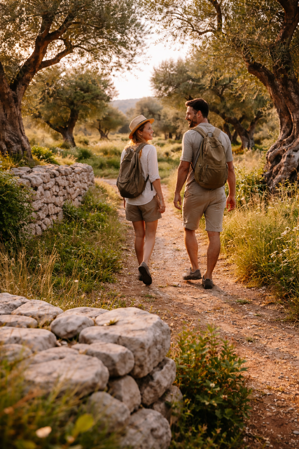 These experiences unfold away from towns and busy shores — along quiet paths, through ancient groves, inside limestone caves shaped slowly by time. Movement feels natural here. A walk without destination. A cycle through open countryside. A pause beneath the shade of an old tree.