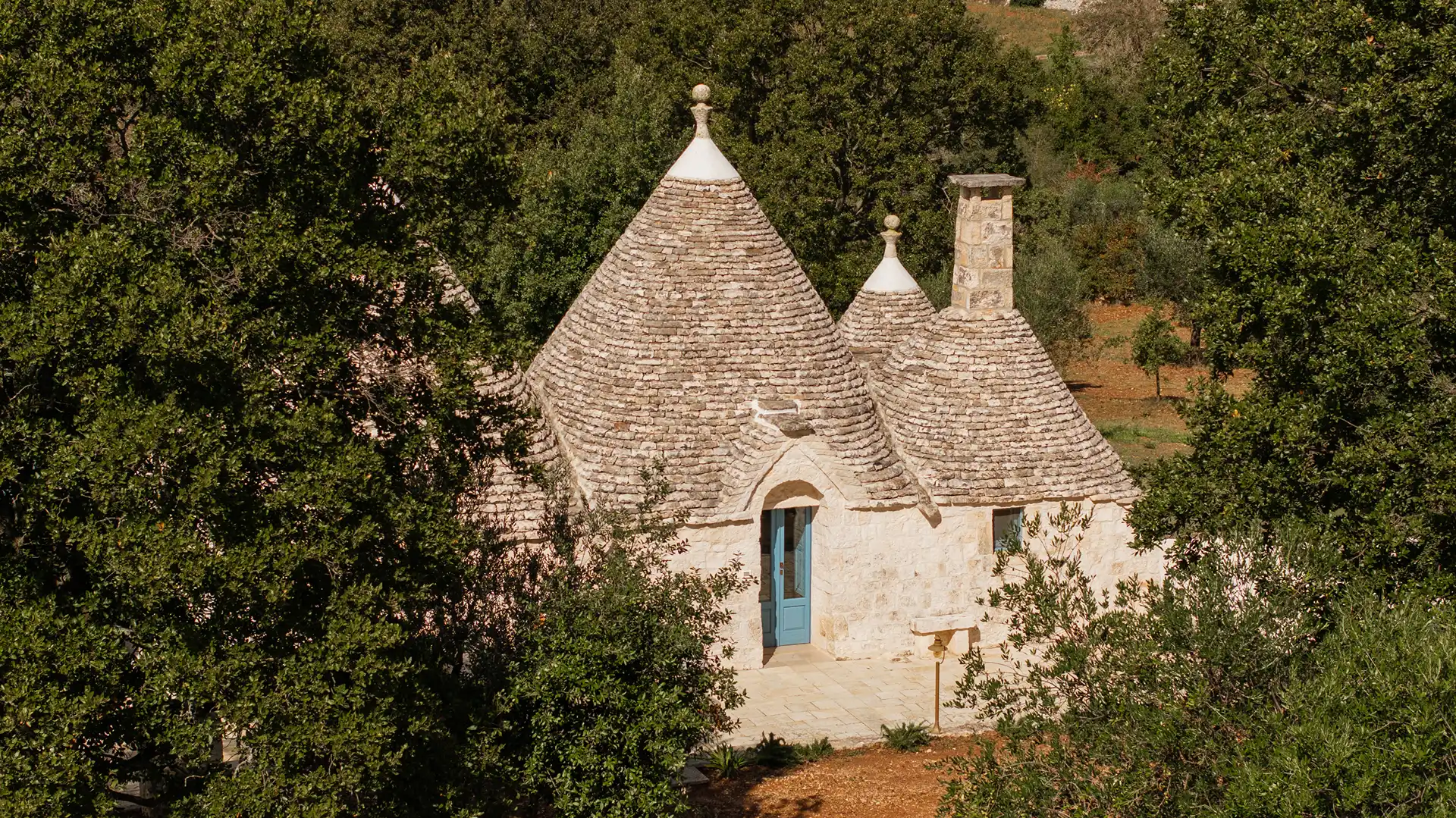 Trullo Elisa is a small, restored trullo set in the Apulian countryside, surrounded by olive trees and a private wooded area. The setting feels quiet and immersive, offering a close connection to nature and a sense of gentle isolation.